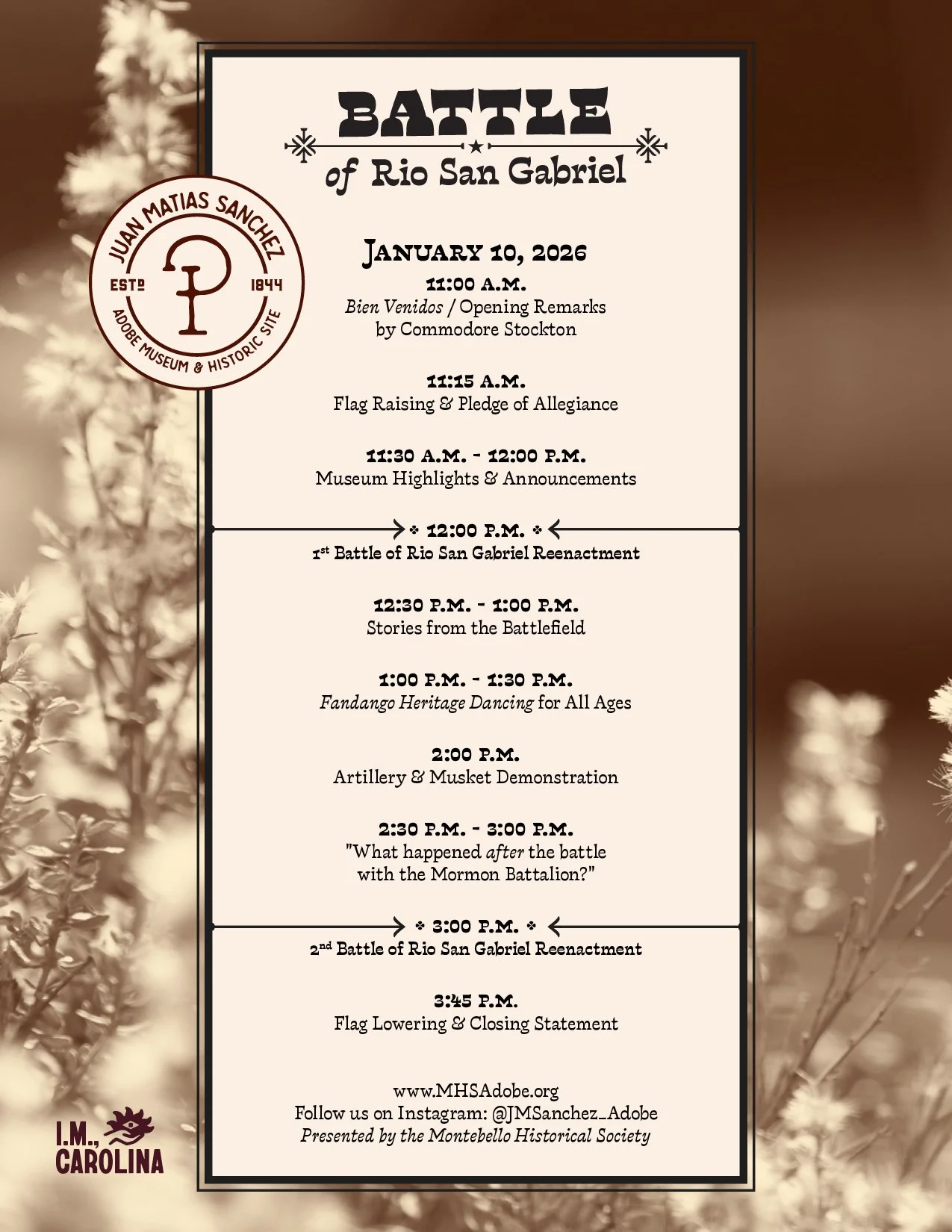 Uniformed American & Californio soldiers re-live the Battle of Rio San Gabriel. This battle played a decisive role in the California campaign during the Mexican-American war. Experience the smell of the black powder from the musket-firing demonstrations. Join us as we set off our CANON! Fun activities for kids; food & drinks are available for purchase.